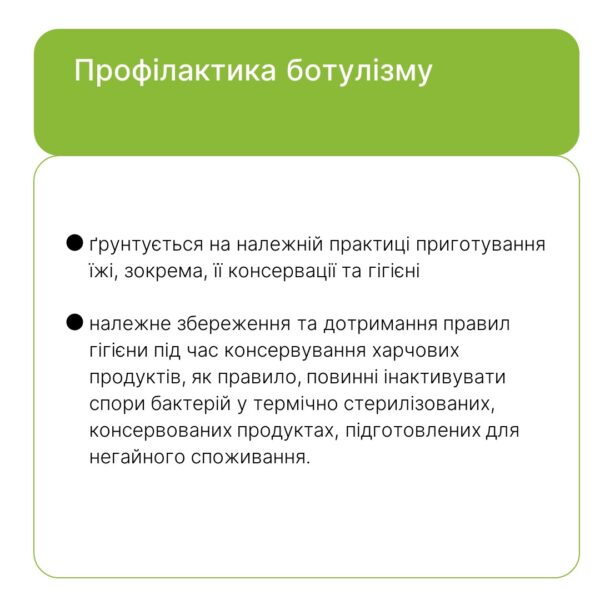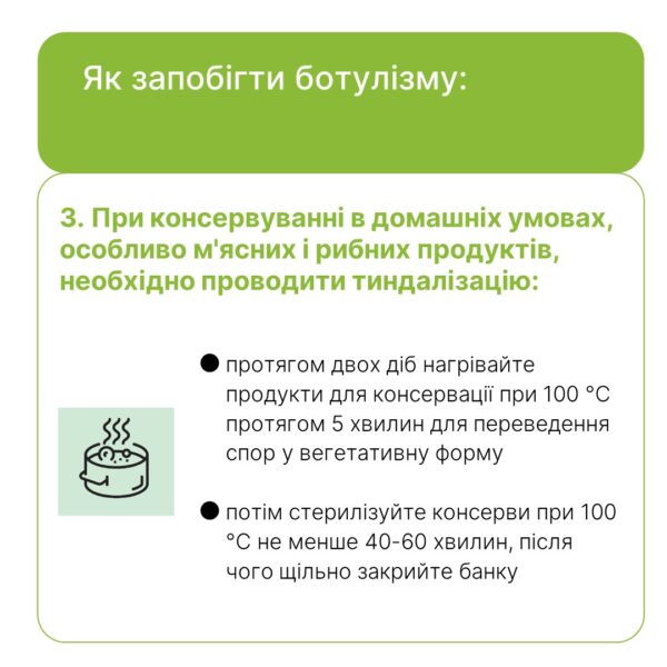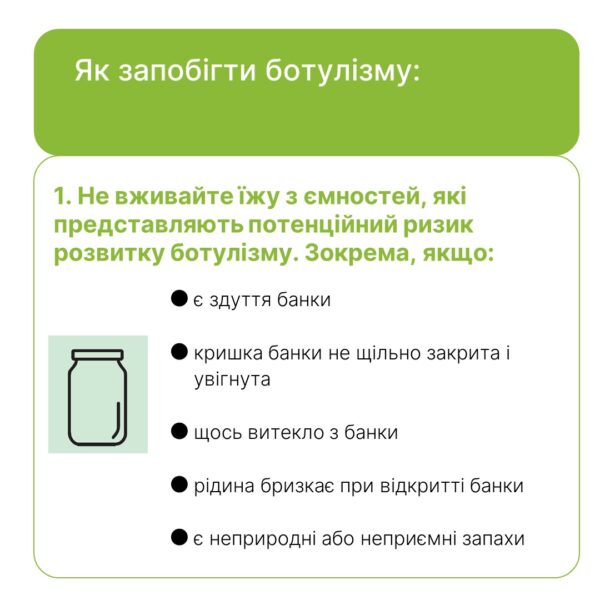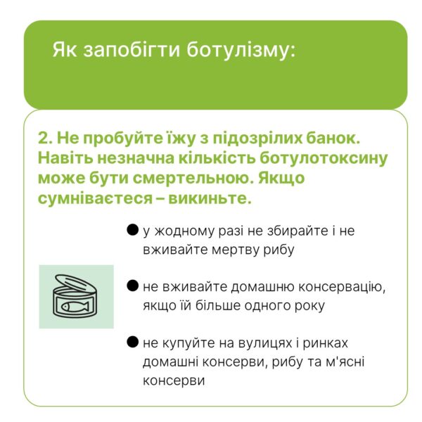 Імовірна причина ботулізму в усіх випадках – продукти домашнього виробництва: домашні паштети, вʼялена риба та мʼясо. Тож вкотре нагадуємо: вживайте тільки сертифіковану продукцію, транспортуйте та зберігайте продукти тільки в холодильнику. Не купуйте продукти – особливо м’ясо чи рибу – на стихійних ринках.
