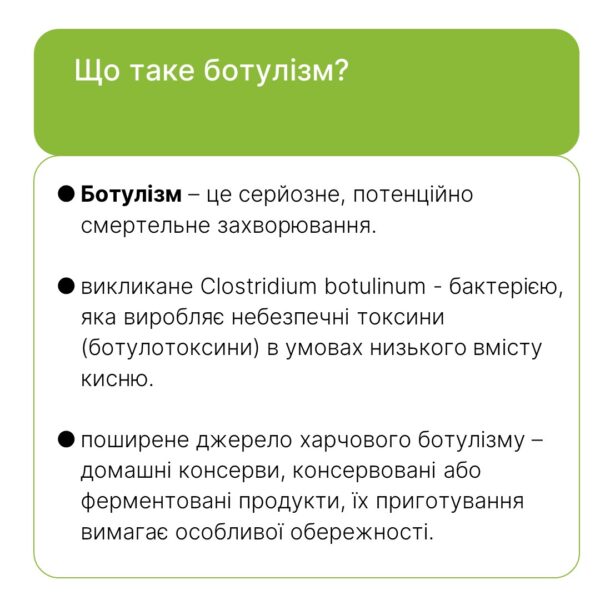 Також потенційно небезпечними є усі консервовані продукти, які були погано вимиті, неправильно/недостатньо термічно оброблені, транспортувались або зберігались неналежним чином. Це можуть бути овочеві, рибні, м’ясні, грибні консерви.