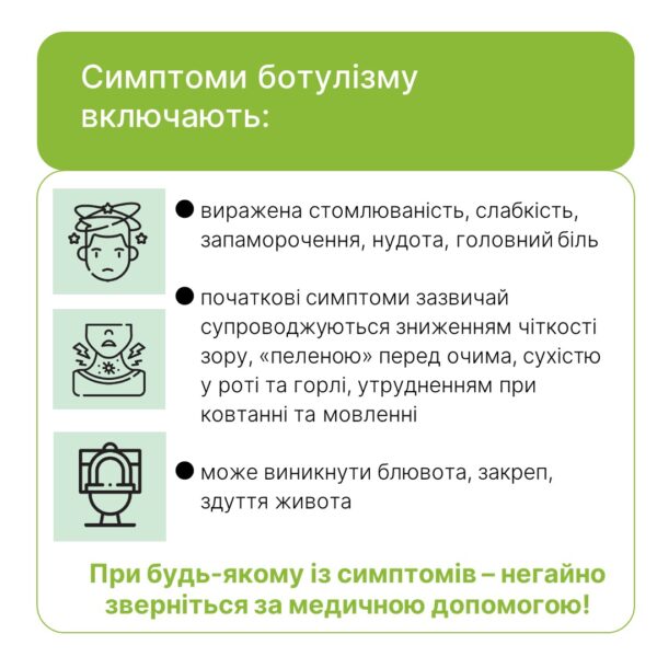 Ознаками харчового отруєння є біль у животі, здуття, нудота і блювання, холодний липкий піт, запаморочення. А при ботулізмі з’являється порушення зору – предмети можуть двоїтися, людину турбує туман перед очима. При перших симптомах отруєння чи інфекційних захворювань – терміново зверніться до лікаря.