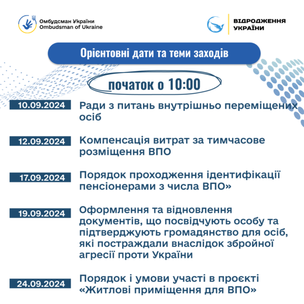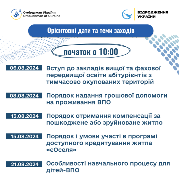 Управління соціального захисту населення райдержадміністрації запрошують ВПО на онлайн заходи, де представники різних міністерств і Офісу Омбудсмана нададуть відповіді на всі питання які у вас виникнуть, починаючи від виплати допомоги на проживання, вступу дітей до закладів освіти, постановки на квартирний облік, закінчуючи компенсацією за пошкоджене або зруйноване майно.