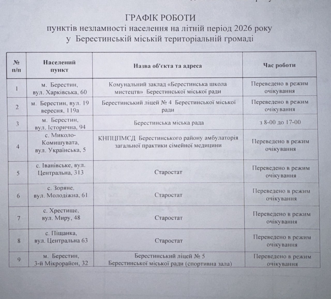 Місцева комісія з питань техногенно-екологічної безпеки та надзвичайних ситуацій ухвалила рішення перевести Пункти незламності на території Берестинської міської територіальної громади у режим очікування на літній період 2026 року.