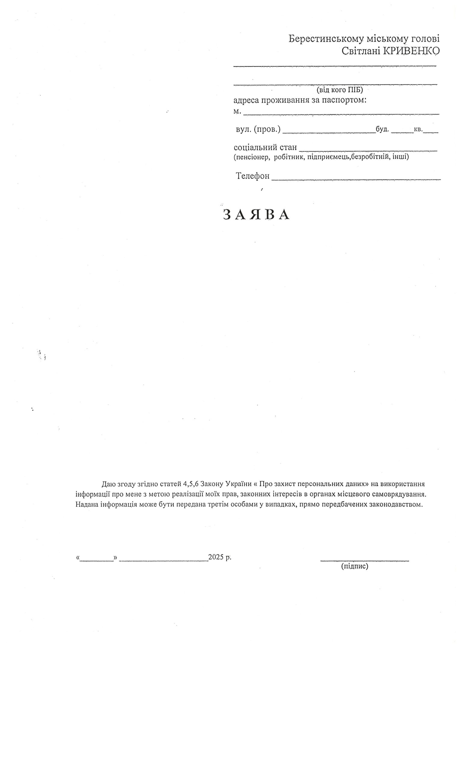 Необхідні запитувачам форми і бланки можна отримати в міській раді за адресою: м. Берестин, вул. Історична, 94.